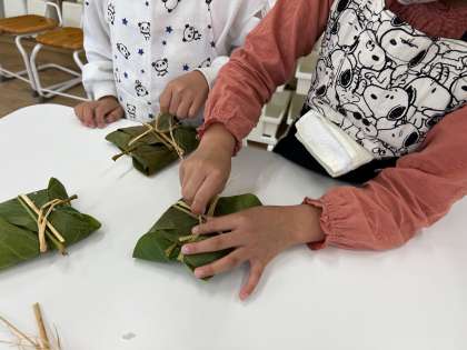ほう葉からごはんが出ないように、気を付けながらわらで縛りました。
