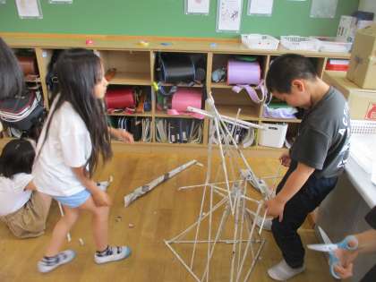 図画工作科の時間に新聞紙で棒を作って組み合わせ、タワーや家などを作りました。グループでどんなものを作るか相談したり、「私これ作るから、〇〇さん棒をたくさん作ってくれる?」など役割を分担したりしながら活動する姿が見られました。