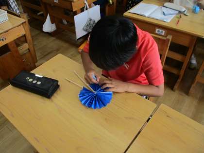 算数の時間に「角」について調べました。今回は、折り紙と割りばしを使って、角の大きさを調べる道具を作りました。