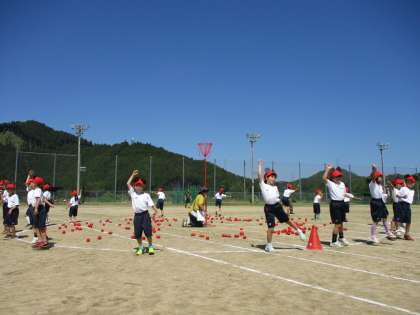 1・2年の団体種目「Ball Bowl Jamboree」です。ジャンボリーミッキーの曲に合わせて踊り、曲が止まったら玉入れを始めます。可愛い踊りと、一生懸命玉を投げる姿がとても素敵でした。他の学年の子どもたちも、思わず一緒に身体を動かしていました。