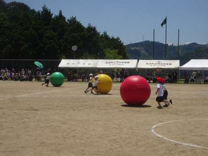 1stステージ種目「大玉転がし」です。自分の背丈ほどある大きな玉を、2人1組で協力して転がしました。楽しそうに笑顔で大玉を転がす姿がとても印象的でした。