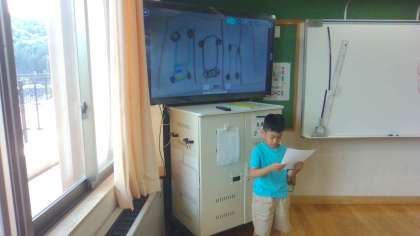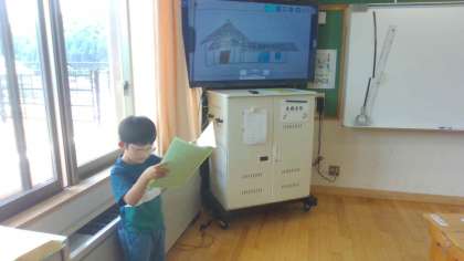 まちたんけんで行った場所や、聞いたインタビューをもとに、京北の町の素敵なところを考え、ロイロノートを使って発表をしました。一人一人、自分の伝えたいことがしっかりと伝わるように頑張っていました。