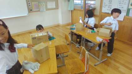図画工作科では、「のぞいて みると」という題材に取り組みました。子どもたちは箱にいくつかの穴をあけ、そこからのぞいたときに見える世界を想像しながら作品づくりを進めました。暗やみに差しこむ光がどのように見えるかを考えながら、穴の位置や形を工夫したり、色セロハンを貼ったりして、光の広がりや色の変化を楽しんでいました。一人ひとりが、自分だけの「のぞき窓」を通して、光と影がつくり出す不思議な世界を表現しており、創造力あふれる作品がたくさん生まれました。