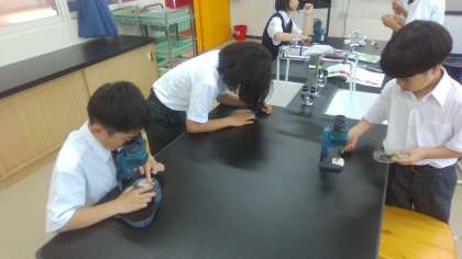 理科の授業では、メダカの観察に向けて顕微鏡の使い方を学習しました。まずは顕微鏡の各部の名称を確認し、ピントの合わせ方について丁寧に練習しました。その後、学校周辺に咲いている植物を採取し、実際に顕微鏡で観察しました。子どもたちは、普段の生活では目にすることのない植物の細かな構造に驚き、興味津々の様子でした。葉の表面に見える細胞や気孔など、肉眼では見えない世界を体験することで、自然への関心や探究心が高まったようです。