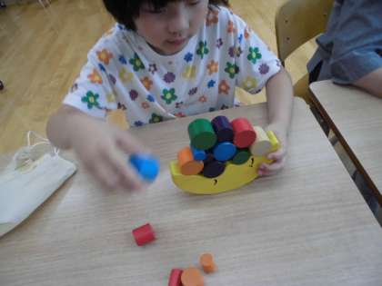 「お月様バランスゲーム」は、ぐらぐら揺れる土台の上にすべての積み木を積み上げるのがとても難しい遊びです。