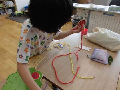自立活動では、ひも通しや洗濯ばさみを使って、指先の力や集中力、手と目の協応を育てています。楽しみながら、生活に必要な力を身につけています。