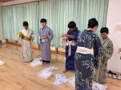 家庭科の授業で和装体験をしました。浴衣を着て、帯を締めて、たたむところまで丁寧に教えてもらいました。「難しい〜」と言いながらもみんなきれいに着付けられていました。また浴衣を着る機会があれば、ぜひ自分でチャレンジしてみてください!
