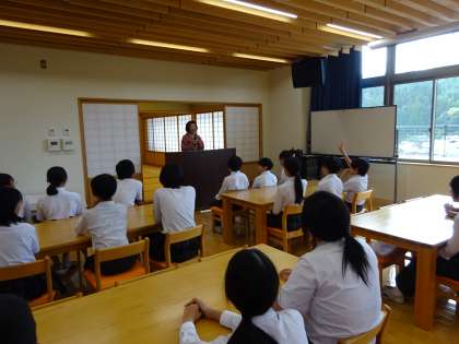 講師の先生をお招きし、茶道体験をさせていただきました。お茶の歴史について講義していただいた後は、実際にお客様をおもてなしする側になって、お菓子をお出しする体験をさせていただきました。いつも一緒に過ごしている仲間同士でしたが、茶道を通じてピリッとした緊張感が場を包んでいました。