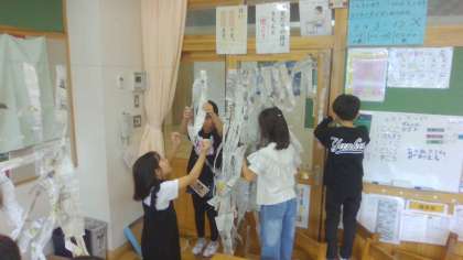 新聞紙を細長くちぎって、つなぎ方を考えながら、教室全体につるす学習をしました。教室いっぱいに広がり、子どもたちの好奇心と冒険心で溢れていました。