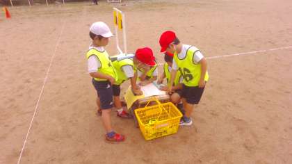 みんながゲームの中で、ボールを蹴ることができるように、ルールも工夫しながら進めています。ボールをドリブルして運んだり、ゴールにむけて蹴ったりするなど、楽しくゲームをすることができました。また、チームでメンバーや作戦を決めるなど、活発的に話し合う姿も見られました。