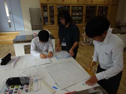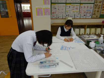 家庭科「思いを形にして生活を豊かに」の学習でトートバッグを製作します。この日は布にしるしをつけ、ミシンでぬうための準備をしました。