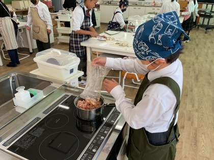 家庭科の授業で「だし」について学習しました。まず、昆布だしとかつおだしをそれぞれ味わい、子どもたちは「おいしいけれど、何か物足りない」と感じていました。次に、昆布とかつおを合わせただしを自分たちで作り、そのうま味の深さを実感しました。さらに、しめじや子宝芋、ねぎなどの食材と調味料を加えて、お吸い物に仕上げました。前回のみそ汁とは違うおいしさに、子どもたちからは「家でも作ってみたい」という声がたくさん聞かれました。だしの力を知り、食文化への理解を深める貴重な学習となりました。