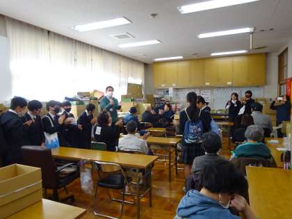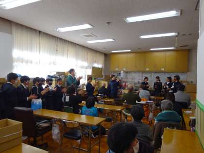 しゃくなげ共同作業所へ到着し、全体であいさつをしました。ここでもグループの生徒が中心となって進めてくれます。