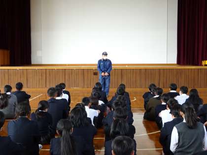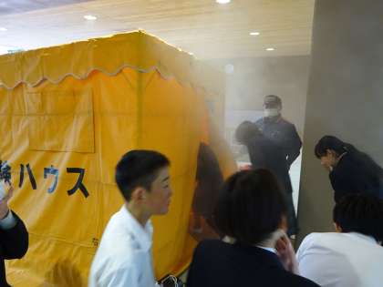 火災を想定した避難訓練を行いました。訓練の後、消防署の方のお話を聞き、「煙ハウス」を体験しました。煙が充満した状況では視界がふさがれるなど、なかなか体験することのできない場面を経験することができました。