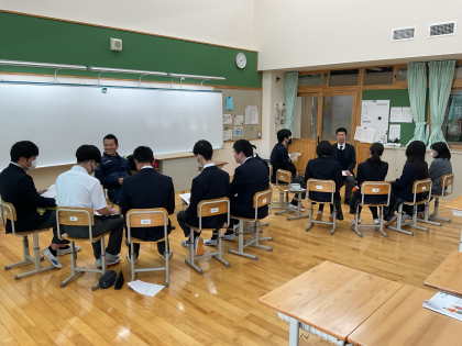 12月12日(金)、3rdステージの『京北ふるさと未来科』で、京北商工会青年部から7名のメンバーをお迎えした授業を行いました。『京北の未来を共に語り合おうの会』というタイトルで、5限は講演を聴き、6限は小グループに分かれて座談会のスタイルで、持続可能な京北の未来について語り合う素敵な時間を過ごしました。