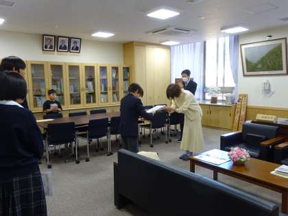 人権標語の表彰式が校長室で行われました。6年生から選出された生徒も、堂々と表彰状を受け取っていました。