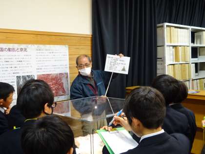 周山城についてもお話を聞くことができました。周山城は、今は周山城跡として京都京北小中学校の近くにあります。周山城のイメージ図を見せてくださったり、周山城を作った明智光秀について話してくださったりしました。