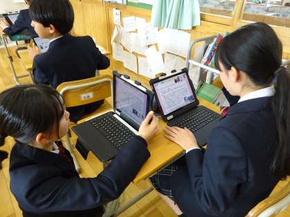 国語科「おすすめパンフレットを作ろう」の学習で、パンフレット作りをしています。グループに分かれて、読む人を引き付けられるよう工夫しながら文章を書いています。書いた文章は、グループのみんなで推敲しています。完成が楽しみです。