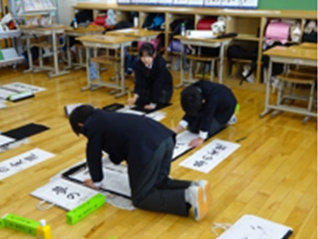 書写の学習で書きぞめをしました。これまでに学習したことをもとに、書きぞめ用紙に真剣に向かう姿が印象的でした。