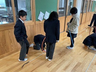 算数の学習で「円周」について調べました。フープを使って円のまわりの長さを測り、直径との関係を確かめました。活動を通して、円周は直径の3倍より少し長くなることに気付き、その比がほぼ一定であることから、円周率(3.14)**を学ぶことができました。算数科の学習で円の周りの事を円周という言葉を学習しました。そこから円の周りの長さは、どれだけなのかをフープを使い調べました。そこから円周は、直径の3倍よりも長くなることを調べて円周率が3.14になることを活動を通して調べることができました。