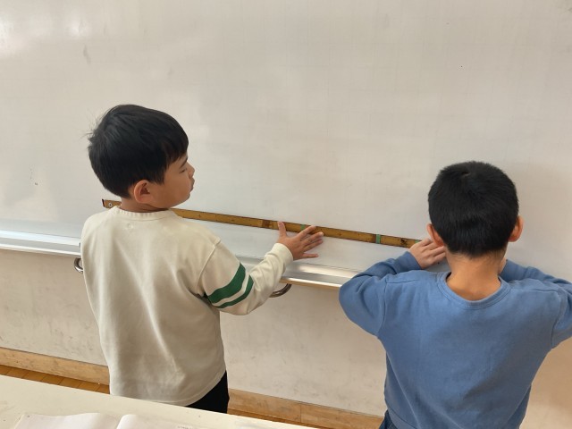 1mの長さをもとに、いろいろなものの長さを予想して調べました。子どもたちは、1mの長さが分かると、長い長さも予想できることを実感しました。自分の予想した長さと近いと、嬉しそうな姿が見られました。
