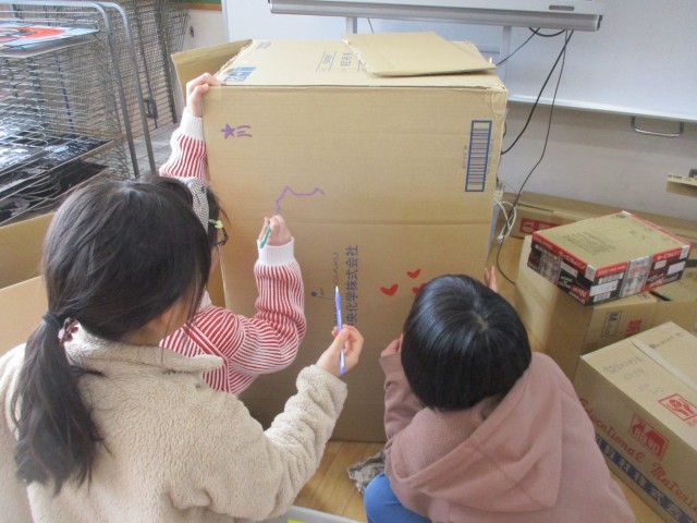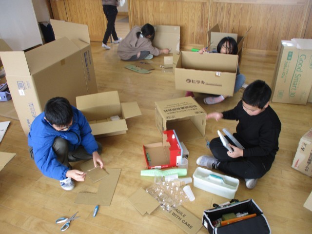 図工の時間に、「自分たちの考える夢のまち」を段ボールで表現しました。段ボールカッターを使いながら段ボールを切ったり、絵の具で色を付けたりしながら自分たちのまちに必要な駅やタワー、お店などを作っていました。