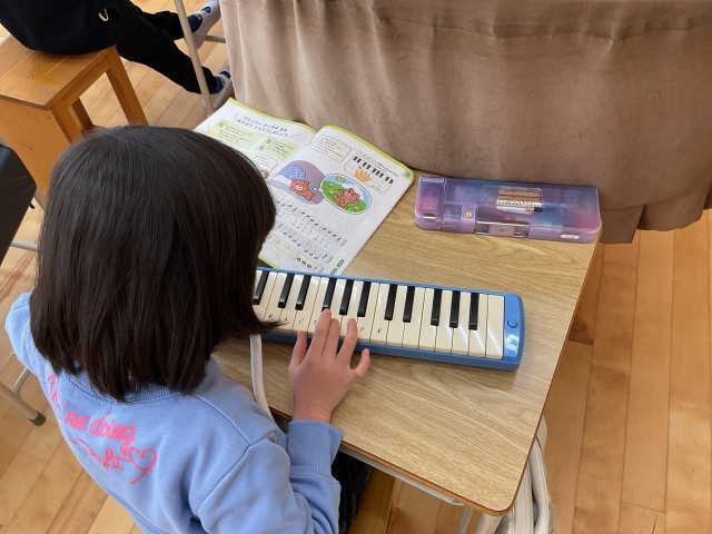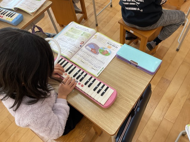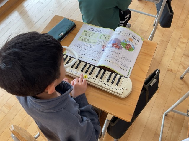 「こぐまの2月」の曲で、鍵盤ハーモニカの学習を進めています。最初は、ドレミの指の位置が動くことに戸惑う様子もありましたが、くり返し練習するうちに、だんだんと自信をもって音を出せるようになってきています。