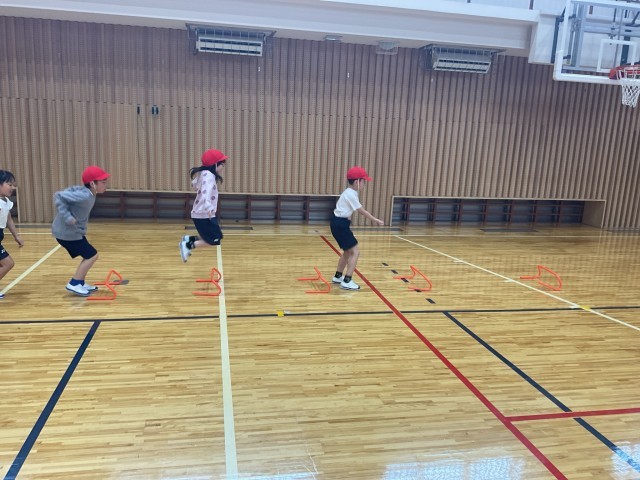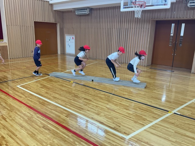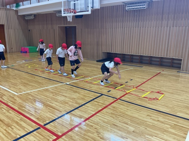 子どもたちが大好きな「まねっこ遊び」に取り組みました。グループになって、先頭の人の動きをよく見て、リズムよく、楽しみながら体を動かす学習です。体をゆらしたり、動物の動きをまねしてみたりするなど、みんなの笑顔がたくさん見られました。特に、友達が考えたユニークな動きを見て「それおもしろい!」「すごいね!」と声を掛け合う姿がたくさん見られ、教室ではなかなか見られない子どもたちの表情が体育館に広がっていました。