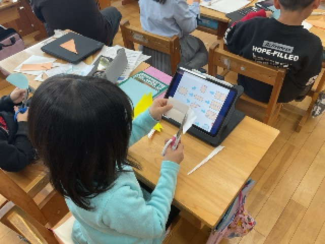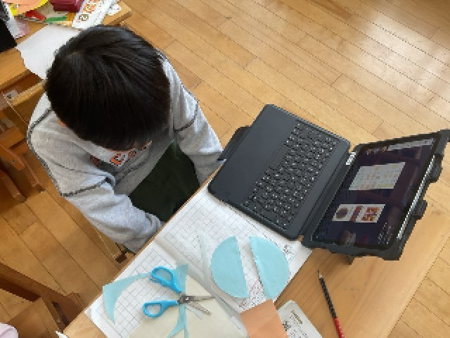 算数では、「分数」の学習に入りました。まず、ピザ、チョコレート、お好み焼きの絵を使って、「これって本当に半分?」「形はちがうけど、大きさは同じ?」など、話し合いました。子どもたちは、形がちがっても、2つが同じ大きさなら半分ということに気付くことができました。また、紙の長方形・正方形・丸い形を半分に切って、友達と見せ合い、確かめることもできました。