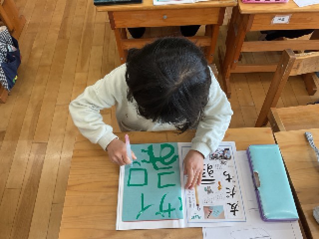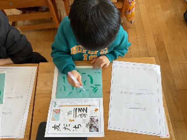 水筆を初めて使って、学習を行いました。2年生にとっては初めての道具でしたが、子どもたちは「どうやって使うの?」「じんわり黒くなるのが面白い!」と、興味津々の様子で取り組んでいました。水筆は墨を使わず、水だけで紙に色がつくため、筆の持ち方・動かし方・力の入れ方を安心して練習できる便利な道具です。今回は、「筆の持ち方」「筆先をそろえる練習」「横画・縦画の動かし方」など、基本の動きに集中して取り組みました。紙に水の線が「すーっ。」と現れるたびに、「できた!」「まっすぐ書けたよ!」と嬉しそうに教えてくれる姿が見られました。この経験をもとに、今後の書写の学習につなげていきます。