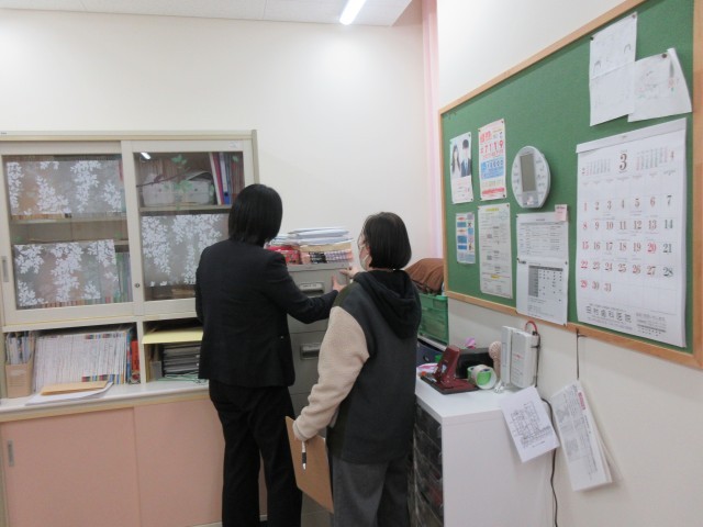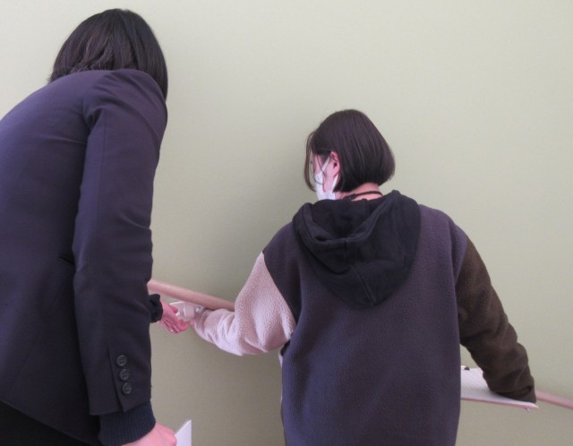 3月の初めに行った安全研修で学んだ点検方法や注意事項を踏まえ、今回はペアになって校内を丁寧に確認しました。