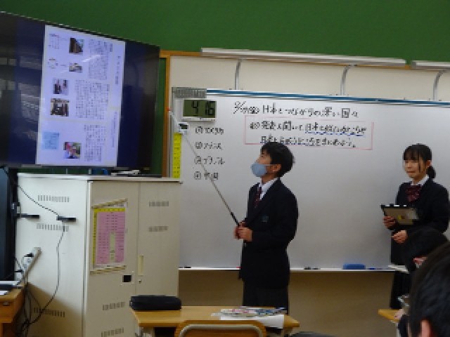 社会科の学習で、日本とつながりの深い国々ついて調べたことを発表しました。日本と似ているところや異なるところに視点をあてて発表したり、発表を聞いたりしました。