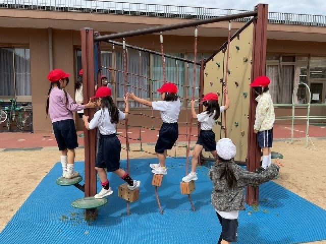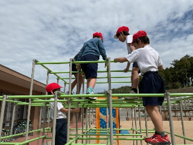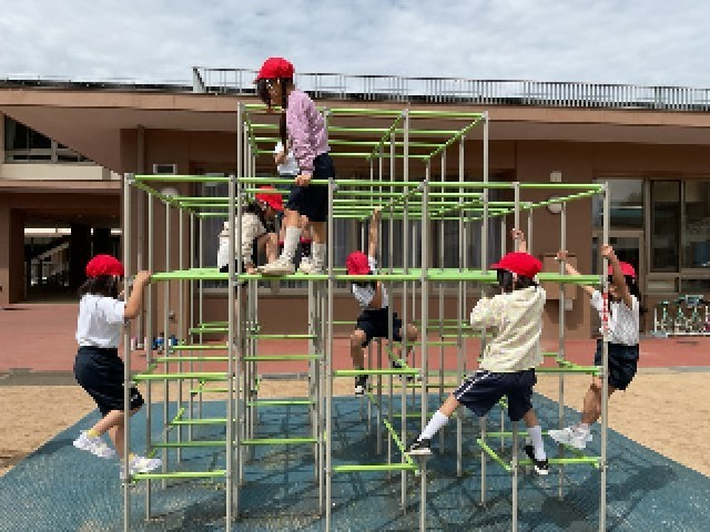 体育の学習で、ゆうぐあそびに取り組みました。活動のはじめに、遊具を安全に使うためのルールを確認し、順番を守ることや周りに気を付けて遊ぶことの大切さを学習しました。その後、ジャングルジムやうんていに挑戦し、登る・ぶら下がる・渡るなど、遊具の特性を生かしたさまざまな動きを楽しみました。子どもたちは、自分なりに工夫しながら体を動かし、意欲的に活動する姿が見られました。