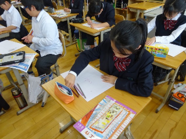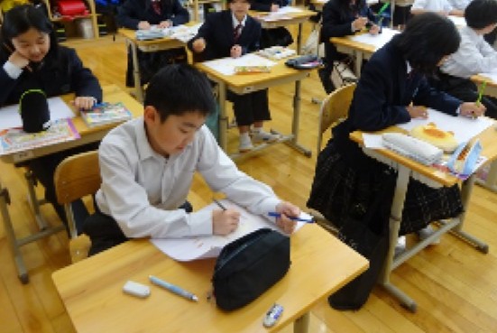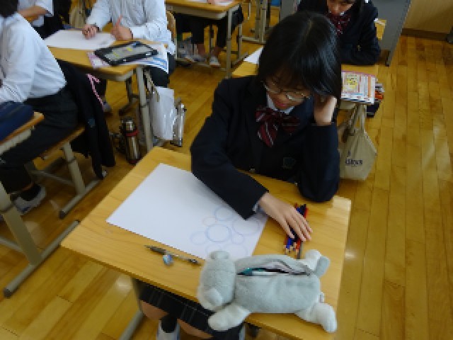 図画工作科「音の絵」の学習の導入で、身近な音を聞いて絵に表しました。同じ音を聞いたのに、人によって表現の仕方が違ったことに驚く姿が印象的でした。