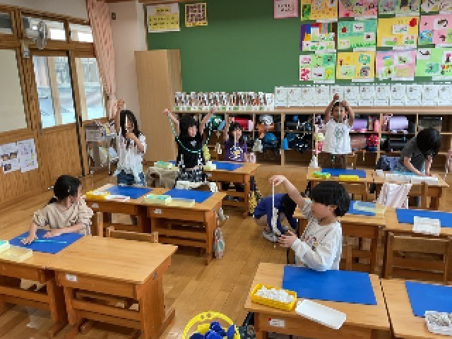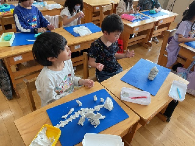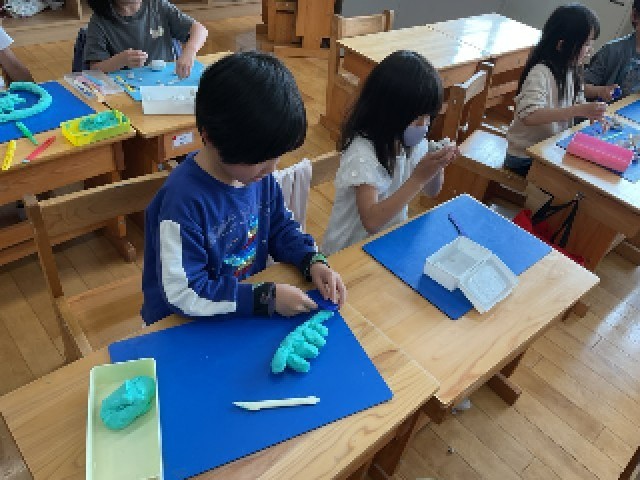 図画工作の「にぎにぎねんど」の学習では、ねんどをにぎる・押す・つまむなど、さまざまな手の使い方を試しながら活動しました。手の形を変えたり、指先を使ってみたりすることで、できあがる形の違いに気付き、作品をいろいな方向から見て、「何に見えるかな」「何ができそうかな」と想像を膨らませる姿が見られました。また、学習のはじめには、ねんどを細長くのばして線をつくる活動を行い、楽しみながら手を動かすことができました。