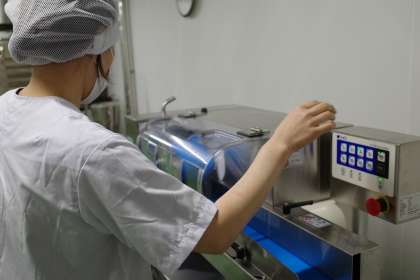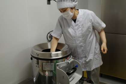 4月14日からは、楽しみにしている給食が始まります。洛西陵明小中学校では1年生〜9年生が同じメニューの給食を食べます。9年生は久しぶりの給食です。給食室では、準備に余念がありません。この日は、様々な機械の最終点検を行いました。これは、野菜の皮むき器と切断機の点検です。