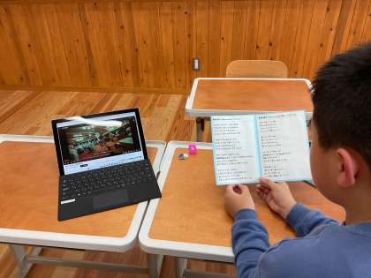 前回の授業では歌詞がまだあいまいでしたが、ひらがなの歌詞カードを見て何回か練習するとあっという間にスラスラと読めるようになり、音楽の再生速度を少しゆっくりめにすると歌えるようになりました。