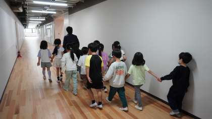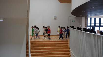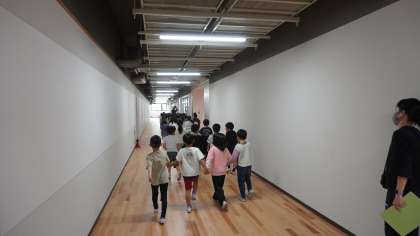 5時間目に学校探検を行っていました。 2年生が1年生の手を引いて、校舎の各教室を回っていました。