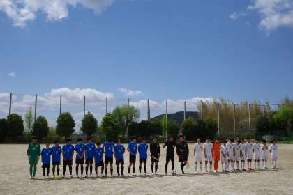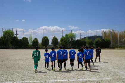気持ち良い青空の下、春季大会の2回戦が大原野中学校のグラウンドで行われました。前回、大勝で勝ち進んだ洛西陵明のイレブンたち。今日も気合十分です。