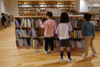 2年生が、総合メディアルームで図書の時間を過ごしていました。たくさんある本を目の前にして、自分の興味ある本を楽しそうに探しています。ある男の子が、好きな本を紹介してくれました。