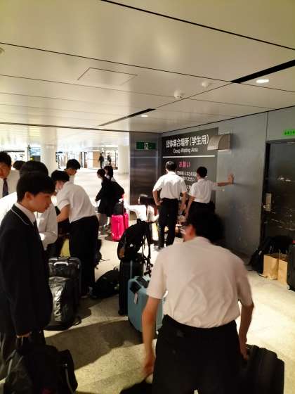 東京駅団体集合場所です。集合完了に間に合うように、お土産片手に続々と集まってきています。