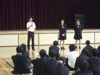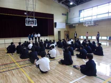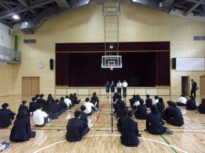 修学旅行のふり返り集会を行いました。 先生や修学旅行実行委員会からの話がありました。