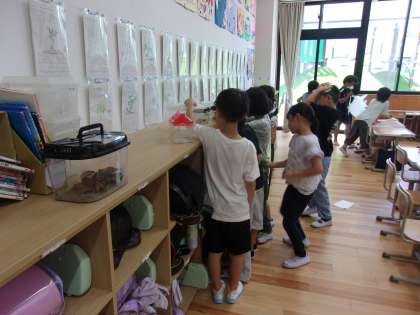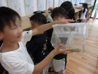 バッタやカマキリなど たくさんの虫を取りました。 みんな興味津々に観察しています。