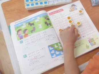 教科書を使って、答えが10になるカードの上に、数図ブロックを置く活動では、自分で計算をしたり、計算カードを使って答えを確かめたりしながら、取り組む姿がありました。