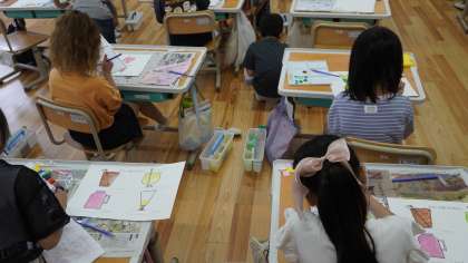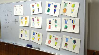 絵の具の色を混ぜて、少しずつ変化する様子を確かめています。