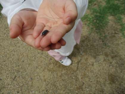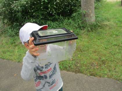「草が元気いっぱいだね」「草のにおいがするよ」「草の中に虫がたくさんいるね」「歩いていると暑くて、汗がいっぱい出るね」「大きい木の下は涼しいね」