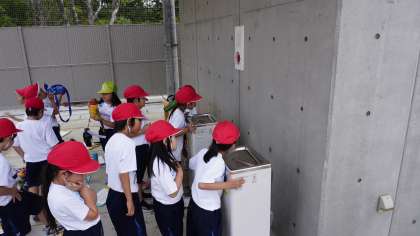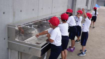 冷水器で水分補給をしたり、水道で腕や首筋を冷やしたり、休憩をとりながら取り組んでいます。