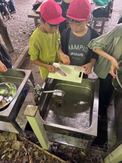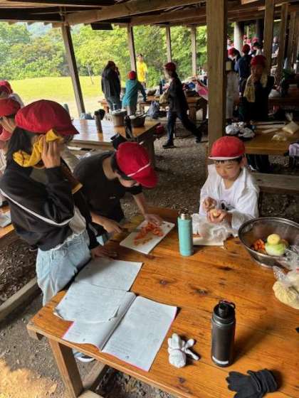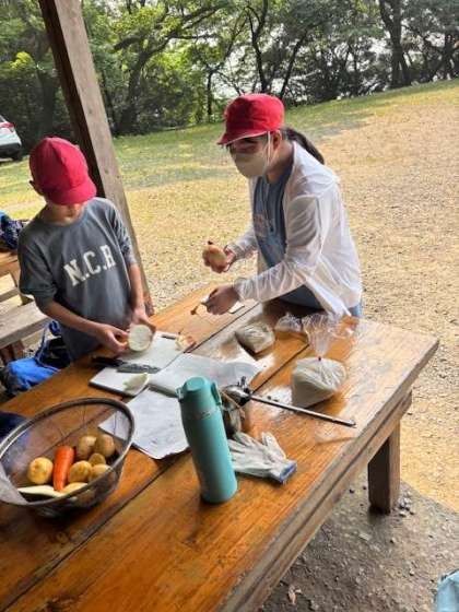 野外炊事が始まりました。 調理グループ、まきグループに分かれて作業を始めています。
