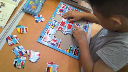 また、予定の内容が終わったら、国旗のパズルをしてカナカナの復習にも取り組んでいます。
