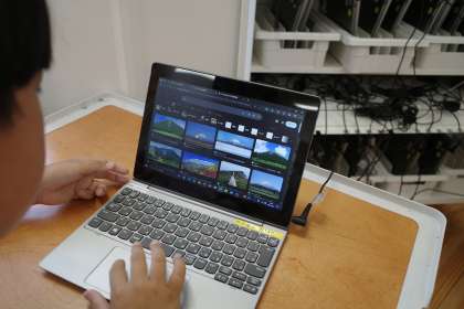 コンピュータークラブでは、プレゼンテーションアプリを活用して、自己紹介のスライドを作成していました。アニメーションなどの効果を活用しながら、自分らしい表現を工夫していました。